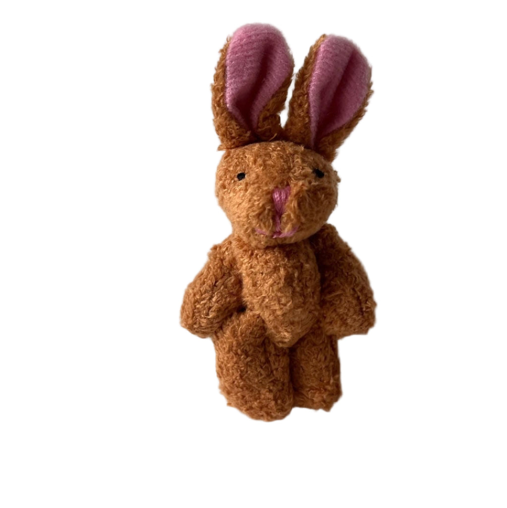 Small stuffed bunny rabbit. Cute little bunny has long ears to hear you better. Eyes and noses of thread. A loop on top to hook onto things. Arms and legs that move back and forth some. This little bunny measures approximately 3.25 inches long. Loves to be in craft projects, dollhouse, party favor. Or whatever you imagine.